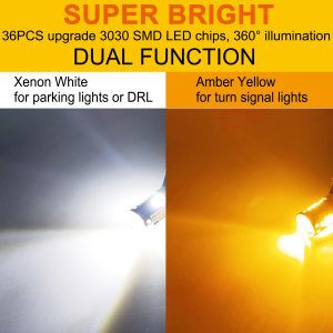 Application: White for parking light/daytime running driving light; Amber yellow for turn signal light. The turn signal flashes "amber-off-amber-off" instead of "amber-white-amber-white" which makes it easier to see(most switchback bulb on the market flash amber-white-amber-white)