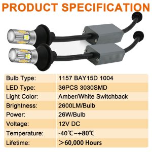 (Set of 2) 36Pcs 3030 high brightness LED chips per switchback LED bulb; Working voltage: 10V-30V (fits 12V, 24V vehicles)