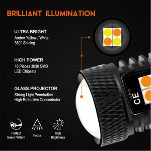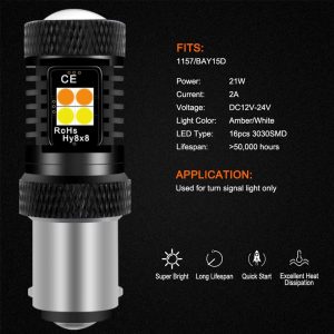 DUAL COLOR FUNCTION: This 1157 Switchback LED lights light up xenon white for parking lights or daytime running lights (DRL lights) while light up amber yellow for turn signal lights. Unlike most turn signals flashing "amber-white-amber-white" on the market, the turn signals flash "amber-off-amber-off," making it easier to see from a distance.