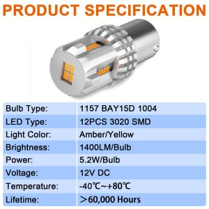 Enhanced Brightness: This set of 2, 2200K Amber Yellow 1157 LED bulbs is meticulously designed with 12pcs high power 3020smd chipset, delivering an ultra-bright illumination that is four times brighter than the original bulb while consuming only 5.2W/PC.