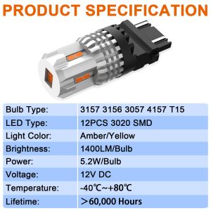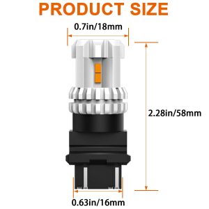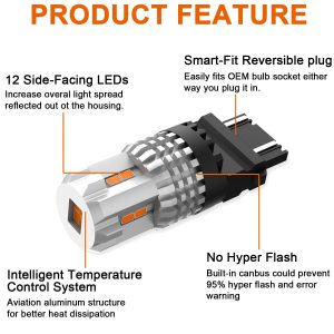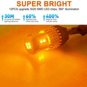 Unique imitated halogen shape design. Resembling halogen bulb shape design and sequencing 12 pieces 3020-SMD LED chips precisely around the light. Delivering 360° high luminous efficiency with full amber light, easier to be noticed and safer to drive