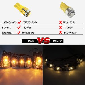 【Easy to Install】Front or rear Installed:these cab marker lights are installed front or rear facing cab roof marker lights as front roof lights. 5 pieces amber T10 194 168 W5W 2825 led bulbs are included and no need to purchase by yourself, save money and time.