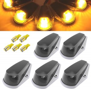 GLOFE 5pcs Top Cab Marker Roof Running Light Smoked Cover Lens 15442 + 5X Amber T10 194 LED Bulbs Compatible with Ford F-150 F-250 F-350 1973-1997 F Series Pickup Super Duty Trucks.