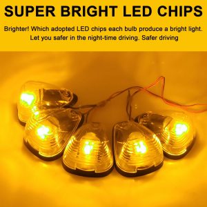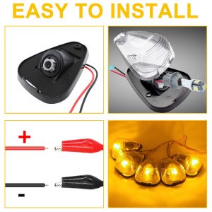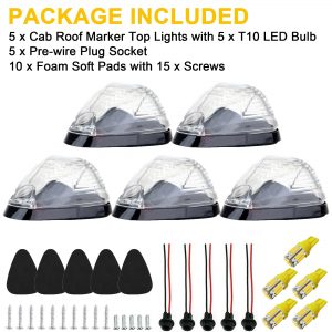 Comprehensive Package: The set includes 5 clear roof cab marker lights with bases (assembly kits), 5 T10 socket wires, 10 soft pads, 15 screws, and 5 amber T10 194 168 LED bulbs.