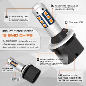 [Extremely Bright]15pcs high power & high brightness 3030SMD LED chips, 360 degree light output; Voltage: 12V-24V; Color:Amber ; High illumination light output: 1100 lumens per.