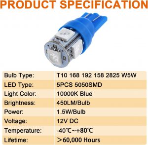 Fitment: T10 instrument panel light bulb is easily integrated as a replacement for the following bulb model numbers: T10, T15, 194, 168, 158, W5W 161B, 168, 168A, 168NA, 175, 192, 193, 194, 194B, 194G, 194NA, 194R, 2821, 2825, etc.