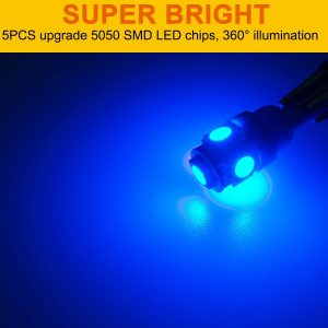 Specification: T10 194 168 Dash Light Bulb Set includes 20X T10 DC 12V dashboard LED bulbs and 20X T10 twist lock sockets. LED Type:5-5050-SMD LED Chipsets. LED light color: Blue.