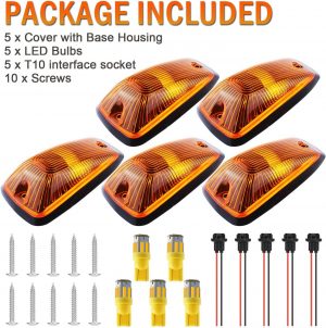 Package Contents: Each pack contains 5 Amber Roof Cab Marker Lights with 5 bases (Assembly Kits) and 5 Amber T10 LED Bulbs. Plus, enjoy peace of mind with AEgle's ONE-year warranty for quality-related issues.