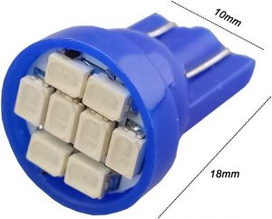 T10 LED Dash Bulbs with Twist Lock Design: GLOFE T10 194 168 Dash Light Bulb Set includes 20 x t10 DC 12V dashboard LED bulbs and 20 x t10 twist lock sockets. LED Type: 8-SMD LED Chipsets. LED light color: Blue. Voltage: 12V.